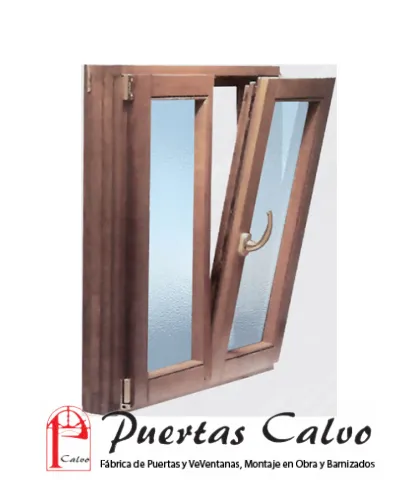 Ventana de madera en Perfil Europeo, el grosor de la ventana es de 60mm, y el grosor del cerco es de 90mm, la ventana este fabricada en madera maciza de pino de la sierra de balsain, tambien podemos fabricarla en otras maderas, incorpora doble junta de estanqueidad, carril de evacuacion de agua, vierte-aguas exteriores, pernios anuba regulables, el sistema de apertura de la ventana es oscilo-batiente, oculto en la hoja, con lo que podemos realizar la apertura de manera tradicional, pero tambien podemos dejar abierta la ventana solo en la parte superior, tal y como podemos ver en la fotografia, servimos tambien la maneta de apertura, el barniz que le aplicamos es especial exteriores al agua, con tratamiento anti-humedad y anti-uva, con lo que podra disfrutar de su ventana durante muchos años.